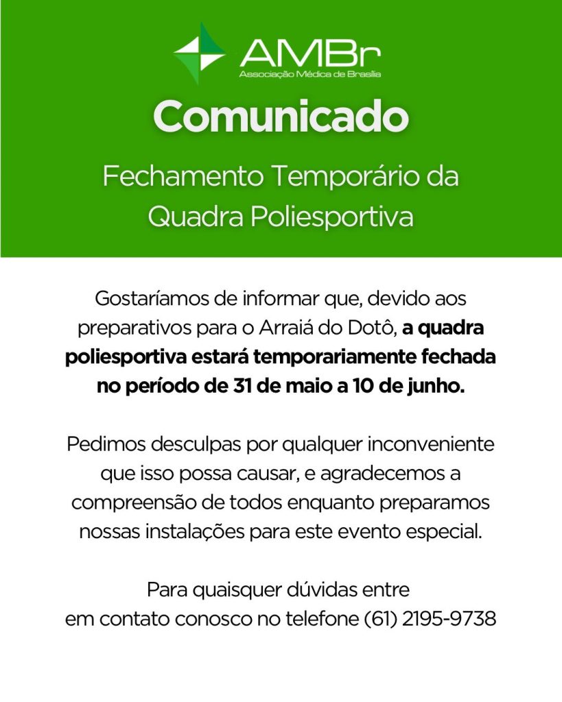 Arraiá do Dotô 2024 Data: 8/6/2024 Horário: 21h Local: Associação Médica de Brasília – AMBr (SCES Trecho 3 Lote 6) Convites: Pelo APP- AMBr-Clube.On ou pessoalmente na Secretaria da AMBr 2º lote: Adulto: R$ 287,00 (valor já com desconto de 50% garantido pela Lei Nº 7.132) Criança (9 a 12 anos): R$ 143,50 Formas de […]