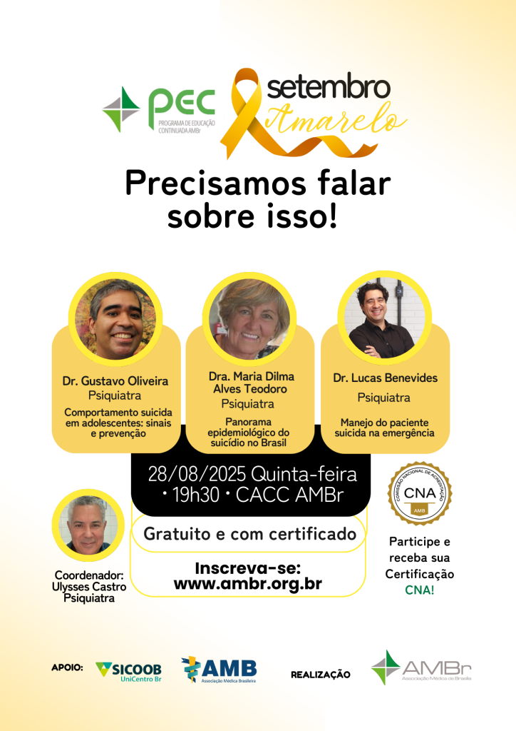 Setembro Amarelo na AMBr: Precisamos falar sobre prevenção do suicídio! No dia 28/08, às 19h30, o Programa de Educação Continuada da AMBr promove um encontro especial com três psiquiatras renomados para abordar o tema de forma clara e responsável: Comportamento suicida em adolescentes: sinais e prevenção – Dr. Gustavo Oliveir Panorama epidemiológico do suicídio no […]