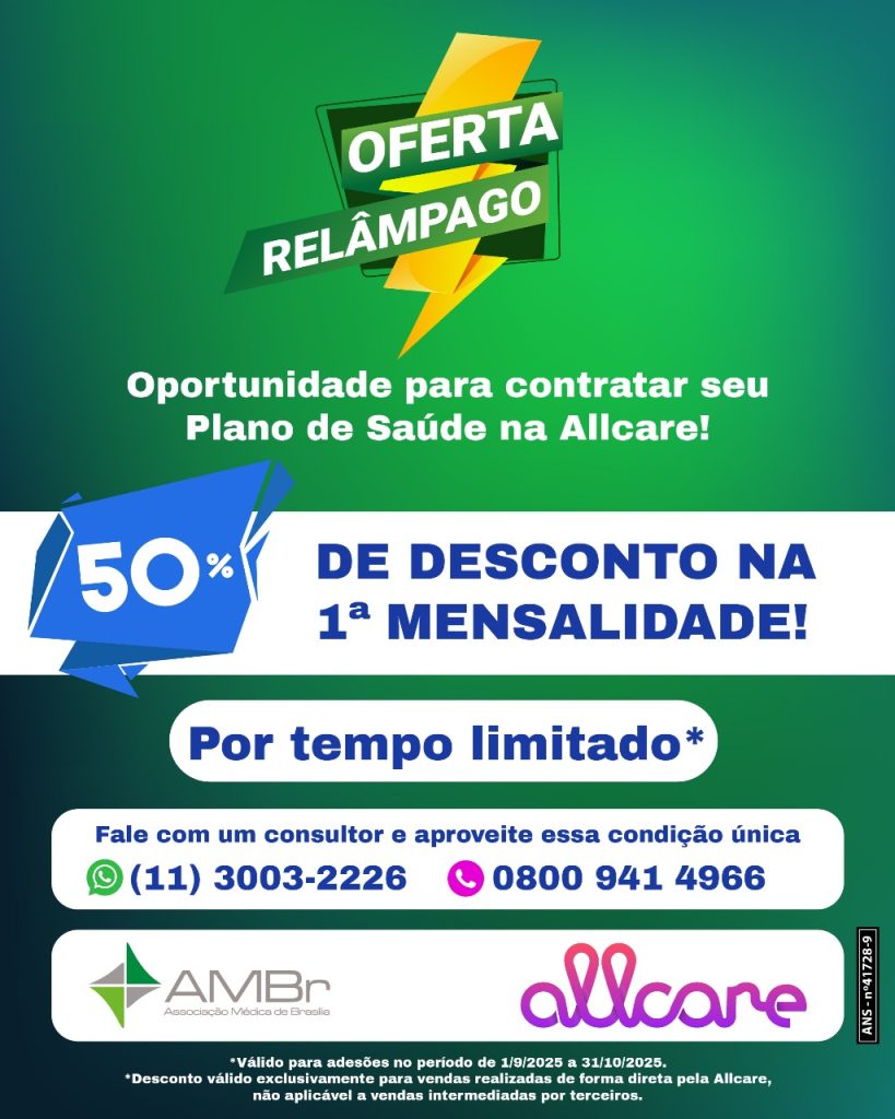 Oferta Relâmpago Allcare + AMBr Essa é a sua chance de garantir um plano de saúde Allcare com 50% de desconto na 1ª mensalidade! Condição exclusiva e por tempo limitadoAdesão válida de 01/09 a 31/10/2025Exclusivo para associados da AMBr Fale agora mesmo com um consultor e aproveite:(11) 3003-2226 | 0800 941 4966